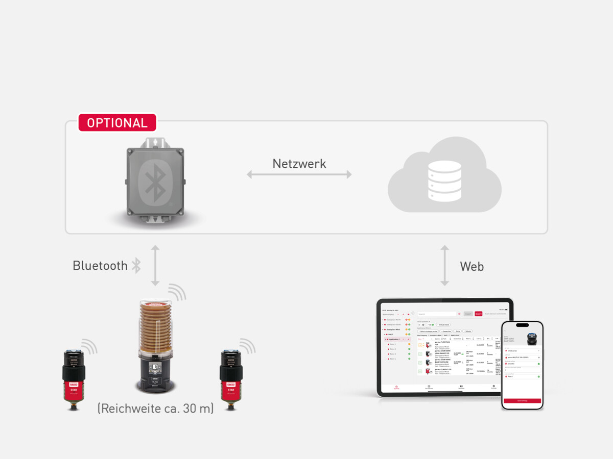 Die bluetoothfähigen perma Schmiersysteme senden Statusmeldungen in Echtzeit über das Gateway BLUETOOTH an perma CONNECT